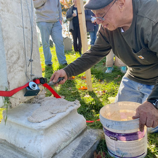 William Killian’s stone was repaired in 2019. Peter Wagner’s memorial was found on its side near the Washington Street gate. It was brought back up to the top of the hill and installed on a granite base in 2022. The gravestone belonging to Charles Hensel was broken into three pieces. It was unearthed in 2019, reassembled in 2023 and re-set in a base in 2024. A fragment of the Hurst stone was found in the cellar at Highland Cemetery. A new base was made and the stone fragment was reset in 2024. The remainder of Jacob Felt’s stone has not been found.